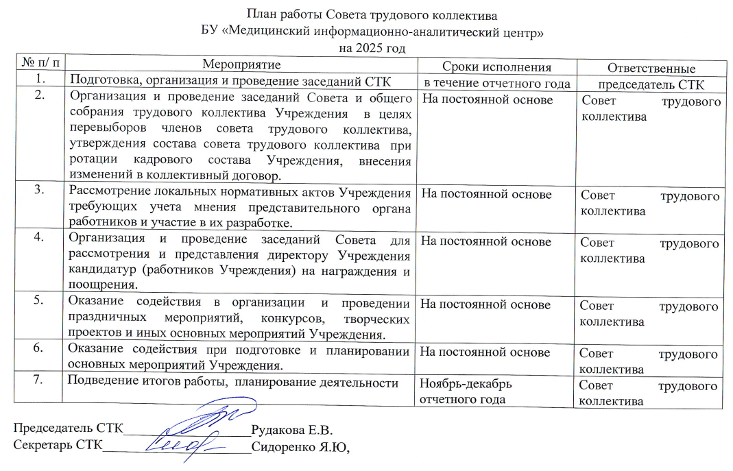План работы Совета трудового коллектива БУ «МИАЦ» на 2025 год